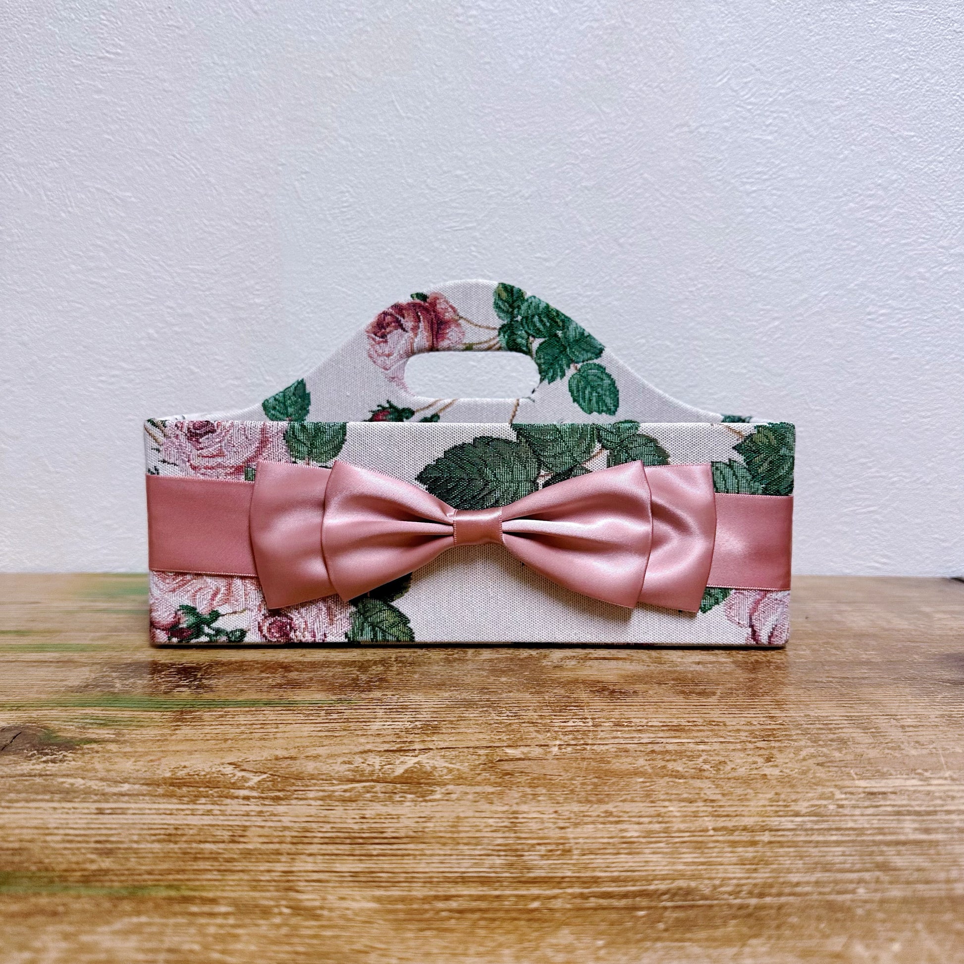 当商品は、リボンが可愛い高級感のあるリモコンラックです。ペンやリモコン、スマホ立てとして机の上のものを収納できます。ひとつあるだけでテーブルがスッキリ!